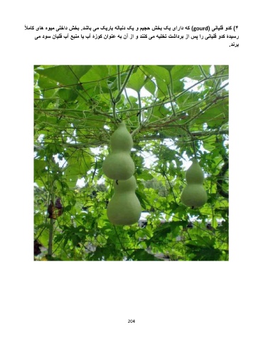 )4کدو قلیانی ( )gourdکه دارای یک بخش حجیم و یک دنباله باریک می باشد .بخش داخلی میوه های کاملاً رسیدۀ کدو قلیانی را پس از برداشت تخلیه می کنند و از آن به عنوان کوزۀ آب یا منبع آب قلیان سود می برند. 204