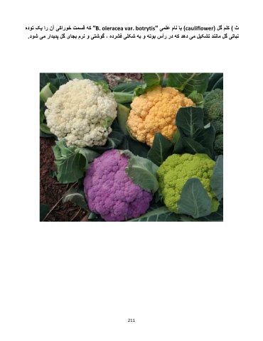 ث ) کلم گل ( )cauliflowerبا نام علمی " "B. oleracea var. botrytisکه قسمت خوراکی آن را یک توده نباتی گل مانند تشکیل می دهد که در رأس بوته و به شکلی فشرده ،گوشتی و نرم بجای گل پدیدار می شود. 211