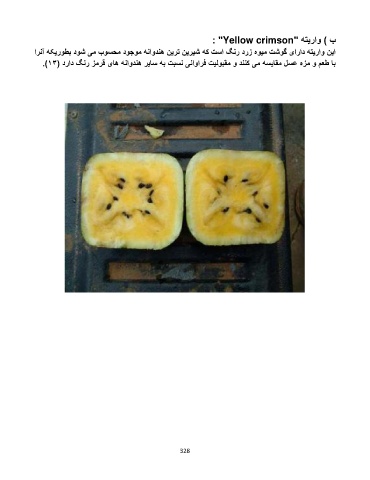 ب ) واریته ": "Yellow crimson این واریته دارای گوشت میوه زرد رنگ است که شیرین ترین هندوانه موجود محسوب می شود بطوریکه آنرا با طعم و مزه عسل مقایسه می کنند و مقبولیت فراوانی نسبت به سایر هندوانه های قرمز رنگ دارد (.)13 328
